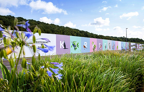The line also inspired the visual identity. This is unlike other ‘expected’ property development branding, again intentionally so. The identity features a contemporary word-mark, impactful blocks of pastel colours, cut-out images of the flora and forna to be seen in Kirkstall Valley, and a simple keyline illustration of the new neighbourhood being created by CEG. What other property brand would lead with a cut-out image of a goldfinch or duck?