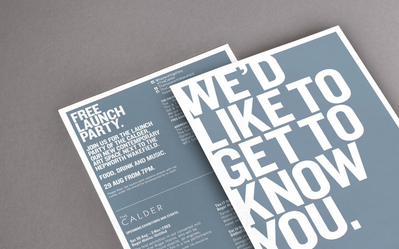 We worked closely with the team at The Hepworth Wakefield to devise the name, visual identity and launch campaign for The Calder. The typographic visual approach uses heavy caps to help to articulate the remit and attitude of the new space with bold, challenging statements. The brand has been brought to life across signage, uniforms, printed publications and marketing material both on and offline, culminating in a hugely successful launch party in August 2013.