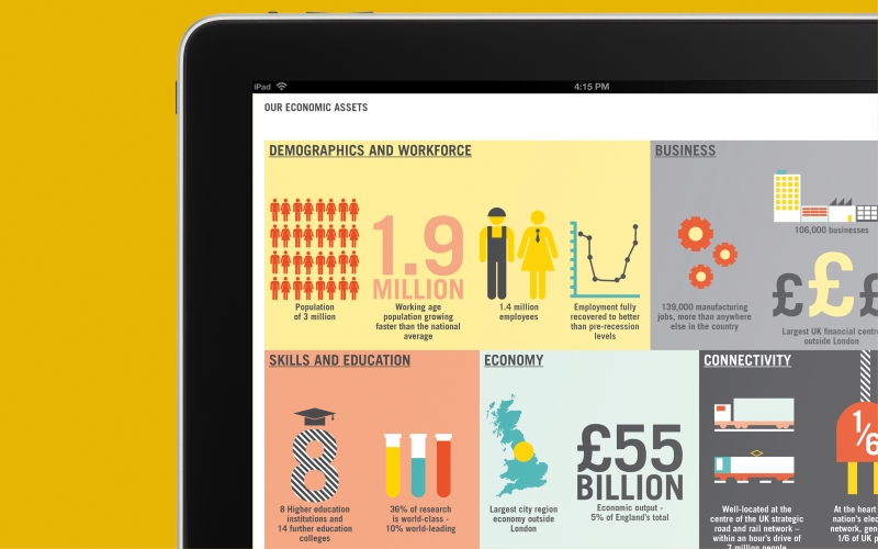Despite its broad influence, the LEP was almost indistinguishable from the city region itself, from its audience’s perspective. They had no logo or identity of their own so weren’t being recognised for their role in the region’s growth. Creating a brand for such a broad organisation was challenging – with audiences ranging from business to politicians to young apprentices; we needed a solution that could adapt to many contexts.